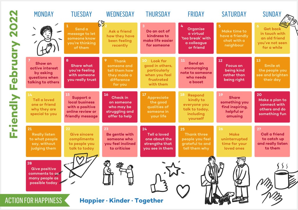 The Action for Happiness charity have released their wellbeing calendar for February 2022