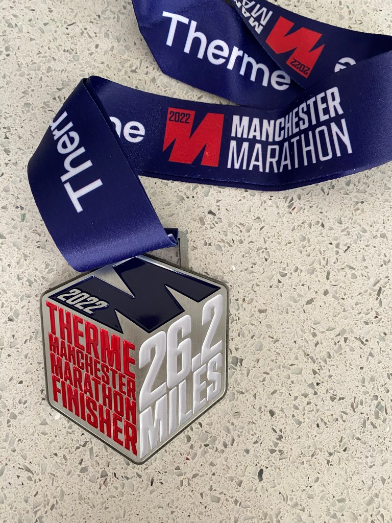 When marathon day dawned on 3 April 2022, I was determined to enjoy it. This was my victory lap for all of my hard work. The weather was perfect, the crowds returned to line the streets, it was a great atmosphere. My wife and son cheered me on in the city centre. I felt good. Manchester Marathon is described as one of the flattest in the UK, although someone decided to put a hill at mile 17 which I was not expecting. My legs felt good up until the 16 mile mark, I had to slow it down slightly but I stuck with it and did what I had to do to get it done. I was delighted to achieve a personal best (this was my 7th marathon). I did it! Achieving not only being marathon ready and finishing but I am enjoying running again.