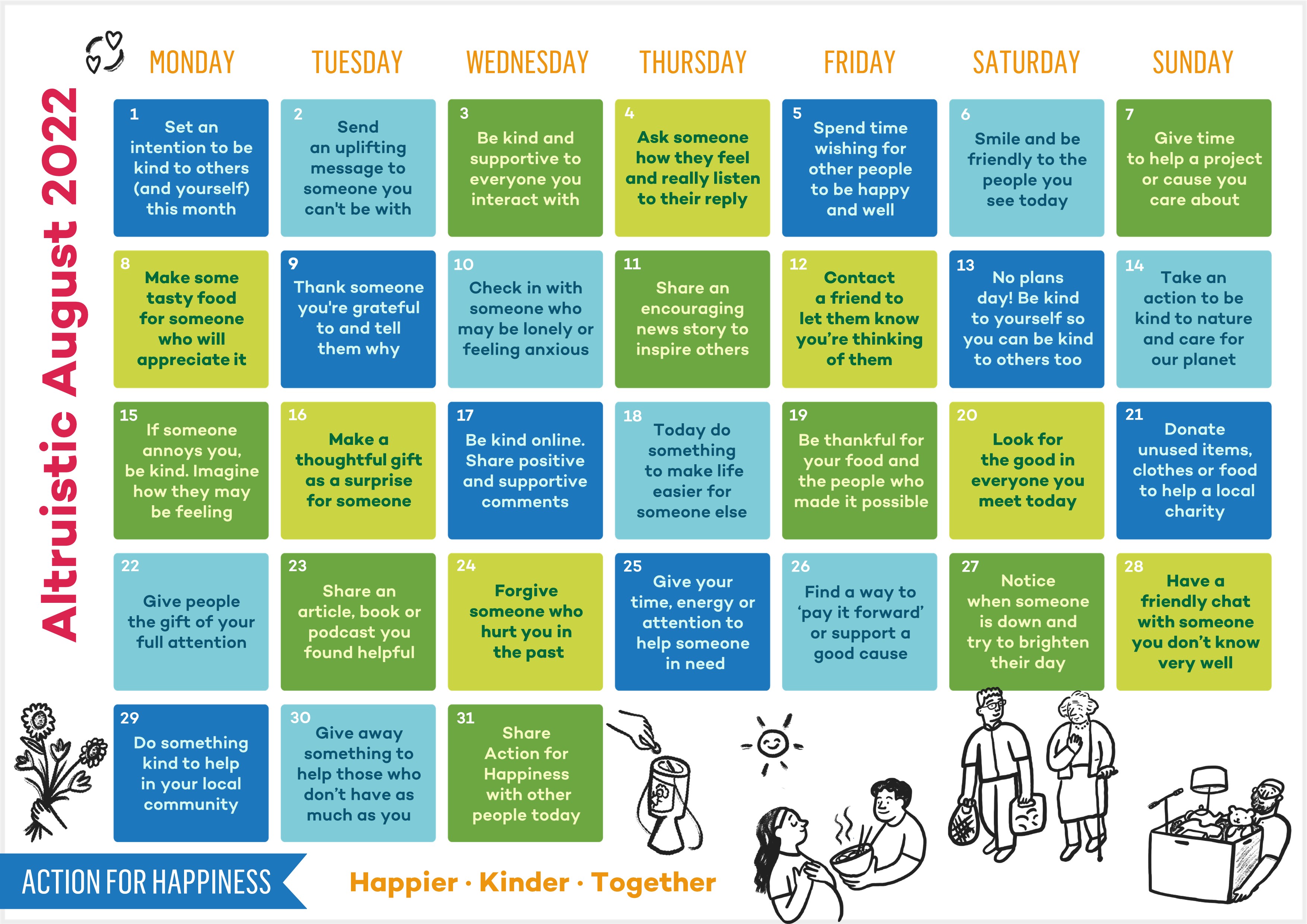 The Action for Happiness charity has released their wellbeing calendar for August 2022.