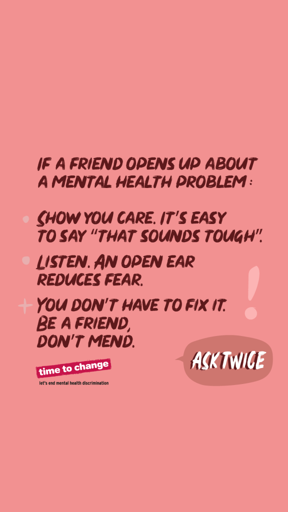 It might take a while for the person to feel comfortable talking about what they’re going through, or there might be periods where they’re less communicative. That’s understandable: sometimes, if you’re experiencing a mental health problem, it’s harder to be sociable.